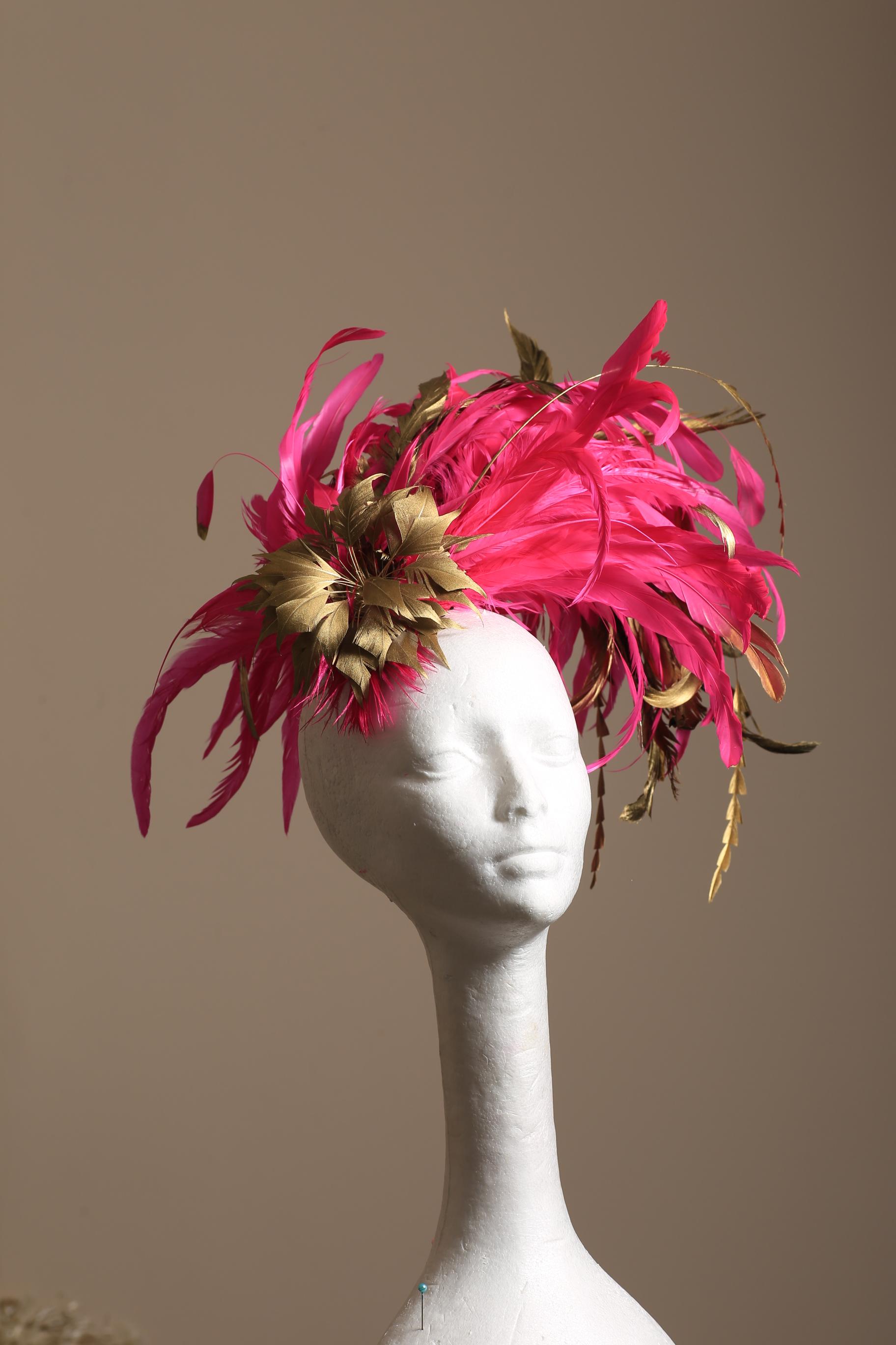 This is a very large Mohawk style pillbox fascinator made using lots of curled coque tail feathers, biots, hackle.