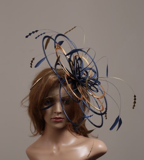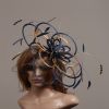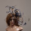 Large sized fascinator hat made up of three tiers of satin loops and adorned with coque feathers.