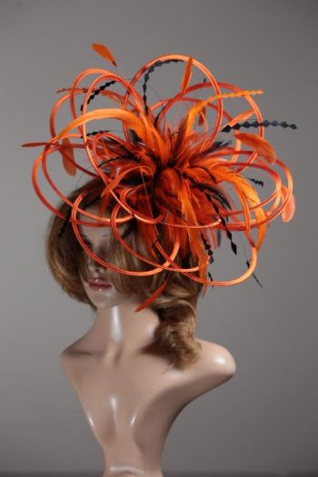 Orange and Black Large Satin Feather Fascinator hat with Chevron Cut Coque Tails – Elise