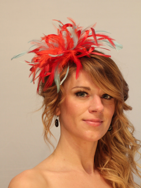 Red and Aqua Satin Feather Small Fascinator hat – Abbie