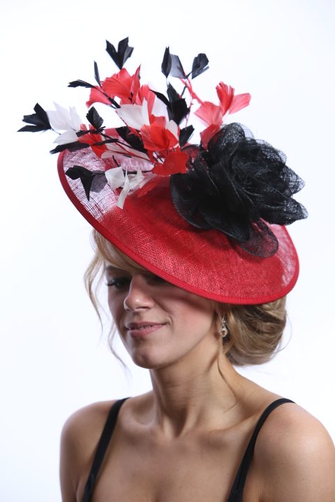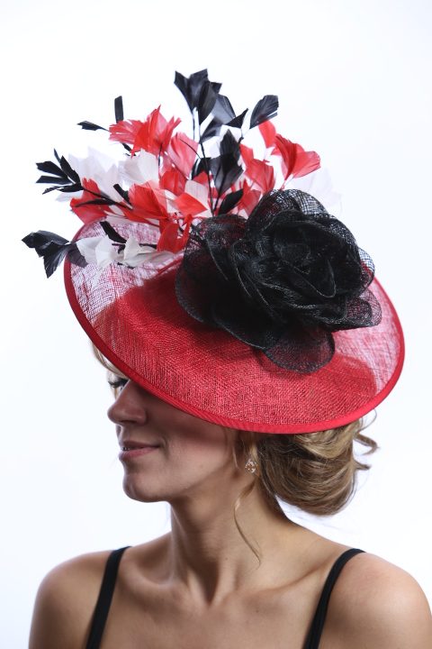 Red Saucer Fascinator, black flower & red, white and black feathers – Molly
