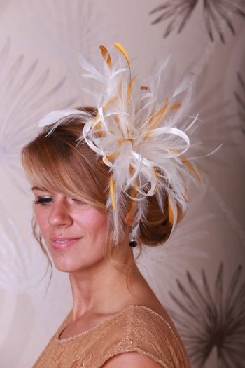 Small Cream Satin Fascinator hat with Mustard Yellow feathers – Abbie