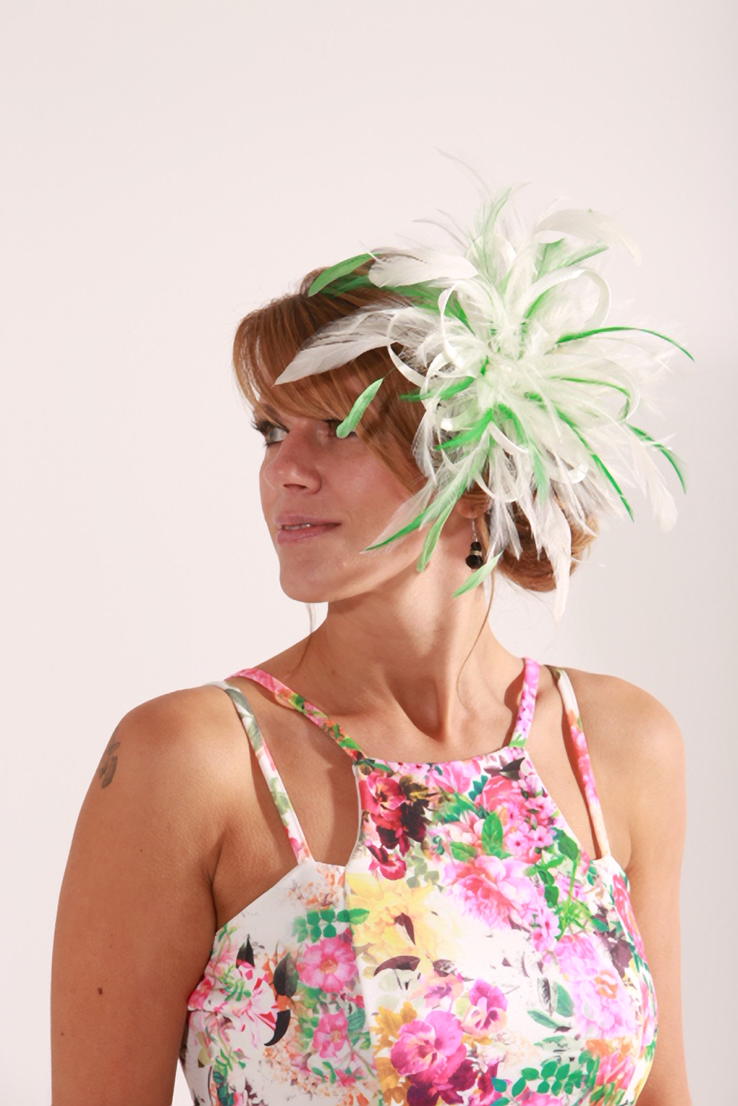 Small Ivory Satin Fascinator hat with Emerald Green feathers – Abbie
