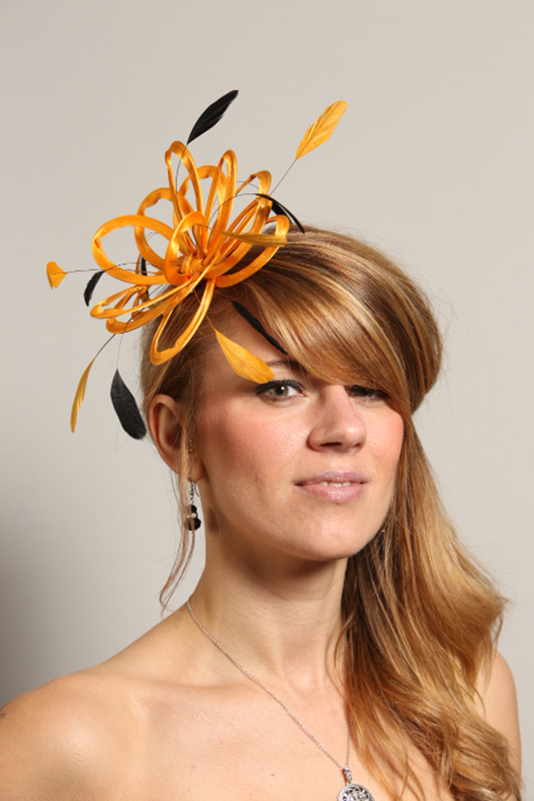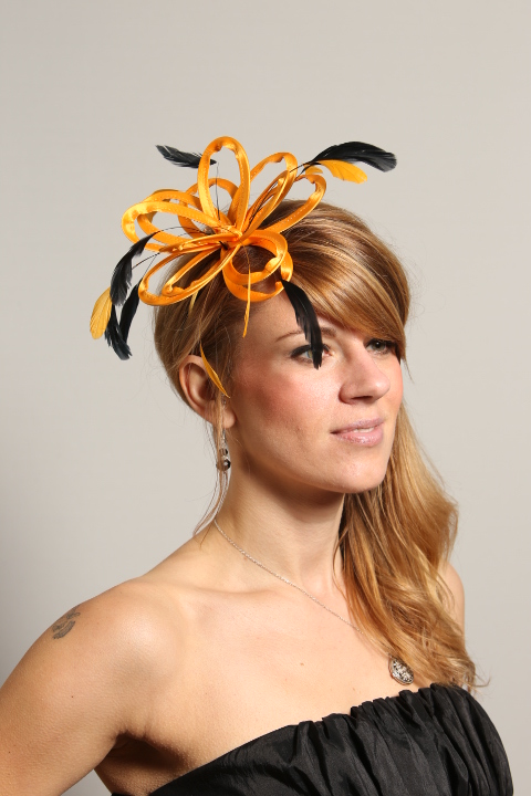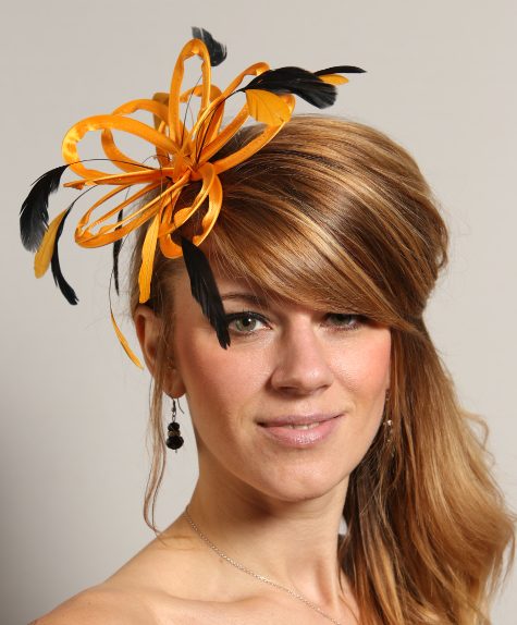 Small fascinator hat in Mustard Yellow made with satin loops and adorned with Black coque feathers. Can be set on a slim metal headband in gold or silver or on a plastic comb.