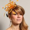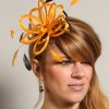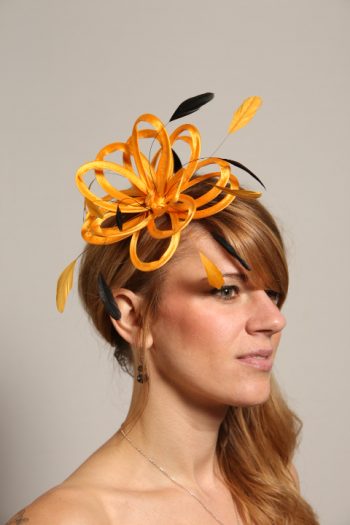 Small fascinator hat in Mustard Yellow made with satin loops and adorned with Black coque feathers. Can be set on a slim metal headband in gold or silver or on a plastic comb.