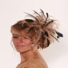 Small fascinator hat made with satin loops and adorned with coque and hackle feathers.