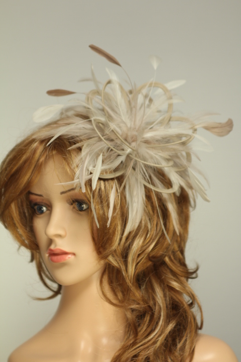 Small fascinator hat made with satin loops and adorned with coque and hackle feathers.